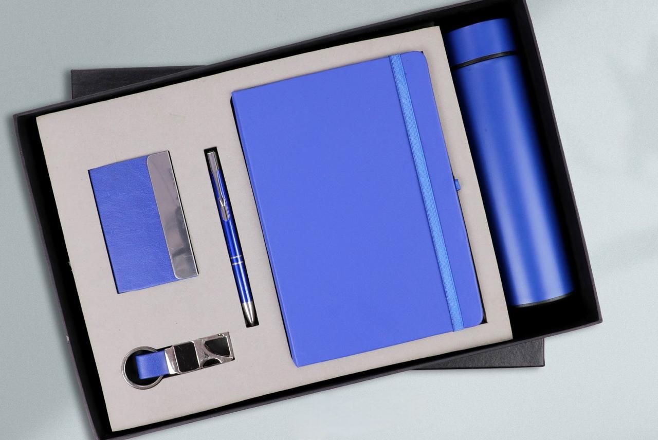 Also included is a compact card holder with a metallic accent, ideal for organizing business or credit cards in a refined way. A stylish keychain with leather detailing complements the set, offering durability with a modern look. Completing the collection is a sturdy, insulated bottle in a rich brown tone—perfect for keeping beverages at the desired temperature while on the go.