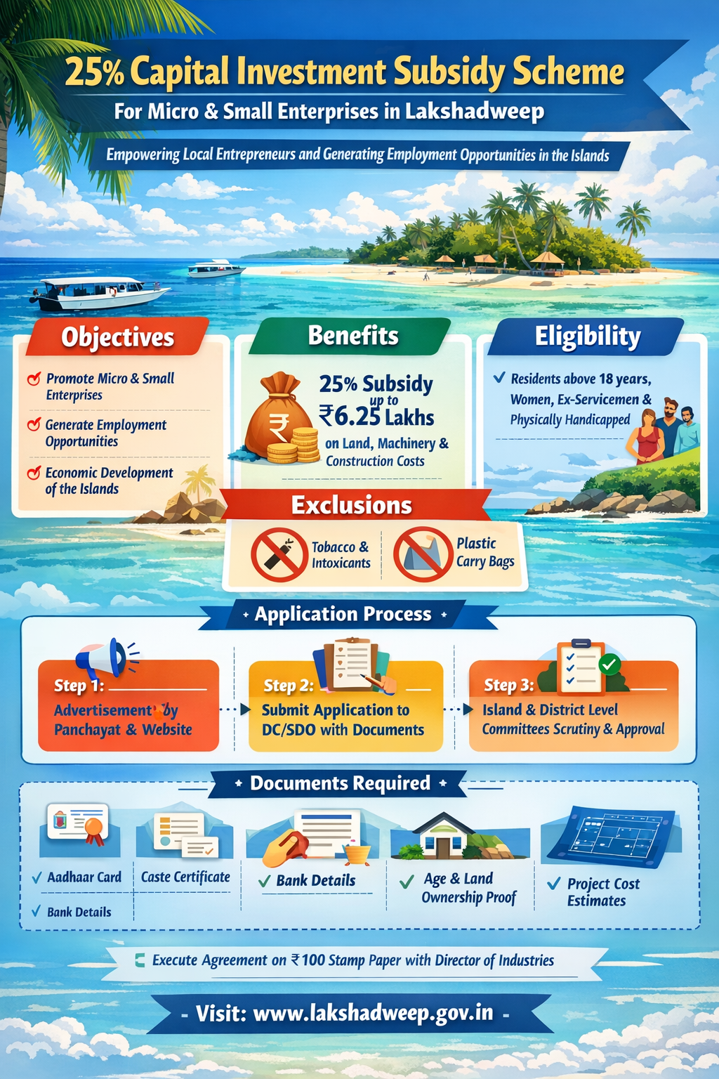 New Micro or Small units engaged in manufacturing/servicing except the activities specified in the Negative List are eligible to claim a 25% Capital Investment Subsidy established in Lakshadweep Islands.