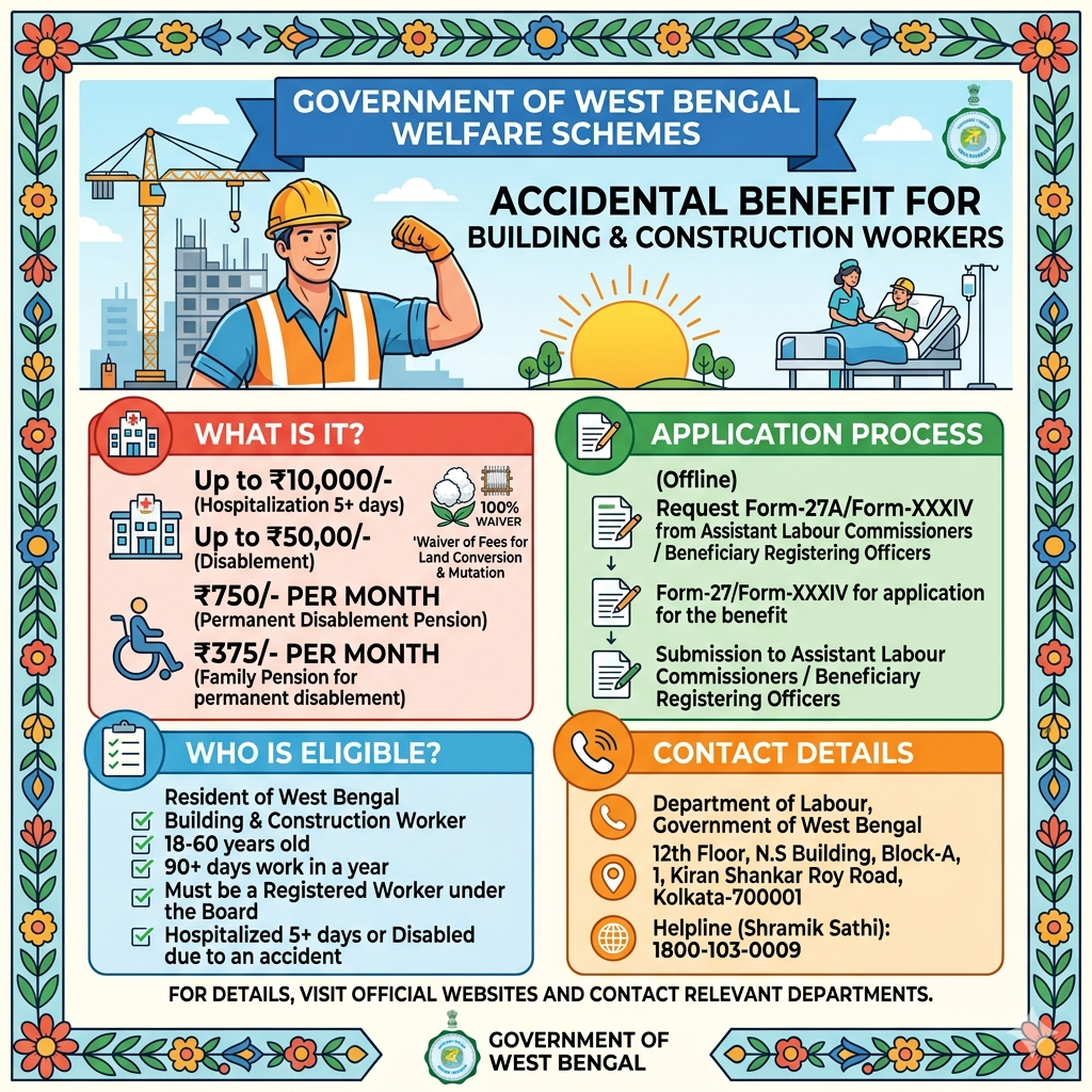 The “Accidental Benefit” scheme by the Building and Other Construction Workers Welfare Board, Labour Department, West Bengal, is a welfare scheme for the registered workers of the board. Under this scheme, the Board shall provide financial assistance to a beneficiary in case of hospitalization for 5 or more days and become disabled due to an accident. A registered construction worker, who becomes permanently disabled, will be entitled to a monthly pension. Also in case of death of such pension holder, his/her spouse/nominee will be entitled to a monthly family pension.