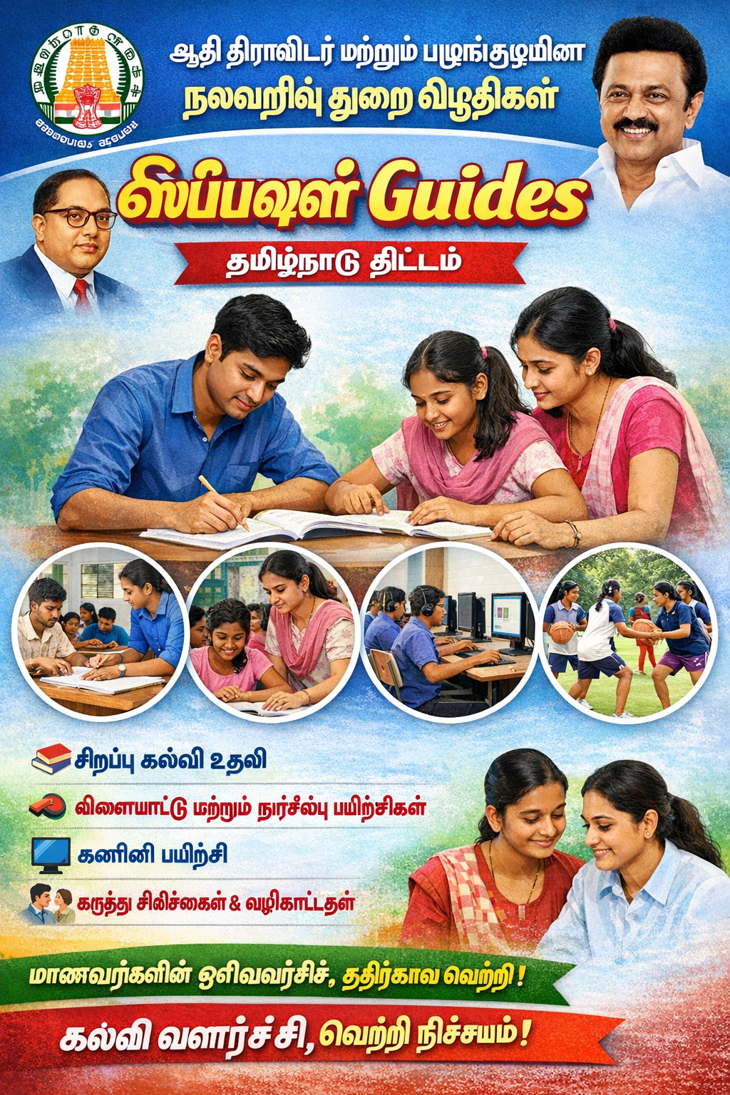 The scheme “Adi Dravidar and Tribal Welfare Department-Hostels: Special Guides” by the Adi Dravidar and Tribal Welfare Department, Tamil Nadu, aims to offer hostel accommodations to students belonging to the Adi Dravidar and Tribal communities. The initiative supports their education by ensuring a safe and structured environment for studying, addressing the housing needs of students from underprivileged backgrounds. The facilities are available for students up to the XII Standard.