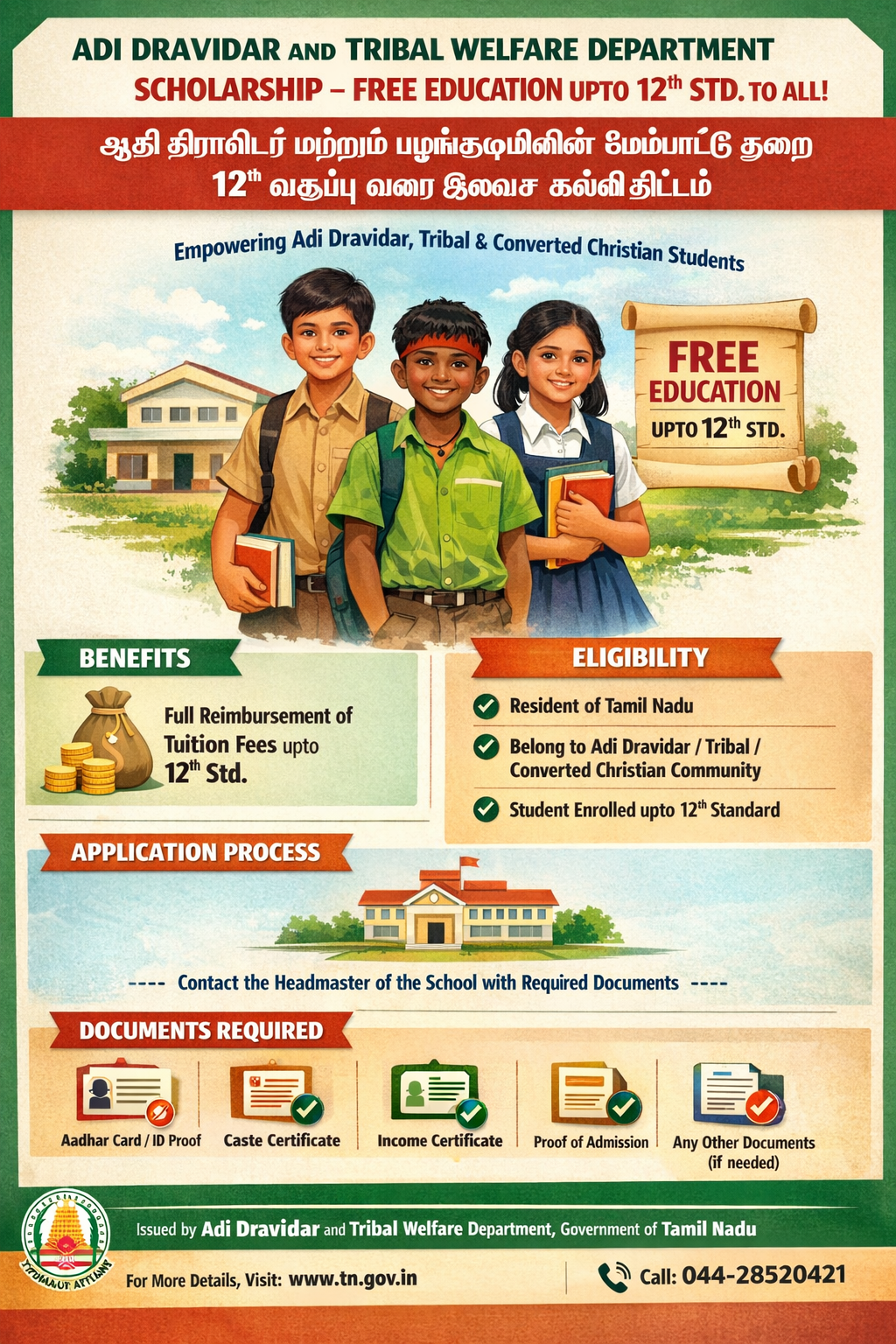 • Adi Dravidar and Tribal Welfare Department: Scholarship-Free Education upto 12th Std. to All