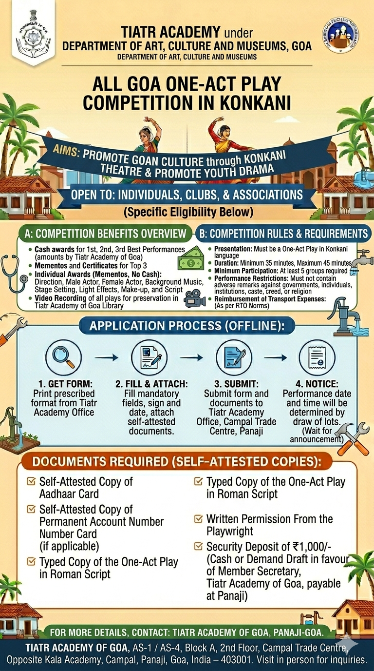 The scheme “All Goa One-Act Play Competition in Konkani” was launched by the Tiatr Academy under the Art, Culture and Museums Department, Government of Goa. The scheme aims to attract youth towards dramatic activities and provide ample opportunities to showcase their talents in dramatics while promoting Goan culture through Konkani theatre. The scheme provides cash awards for the top 3 performances along with mementos and certificates, individual awards for various categories like direction, acting, music, and stage setting, and reimbursement of transport costs as per Regional Transport Office norms. The applicant must be an individual, club, or association capable of presenting a One-Act Play in Konkani with duration between 35 to 45 minutes, and must submit a typed copy of the play in Roman script along with written permission from the playwright. The scheme is implemented by Tiatr Academy of Goa. The applications for this scheme are accepted offline.