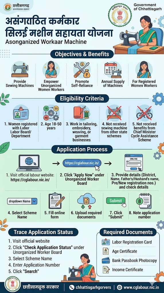 The Asangathit Karmakaar Silai Machine Sahayata Yojana (Unorganized Workers Sewing Machine Assistance Scheme) is a government scheme in Chhattisgarh State that provides sewing machines. The objective of this scheme is to promote unorganized workers in their businesses and make them self-reliant.