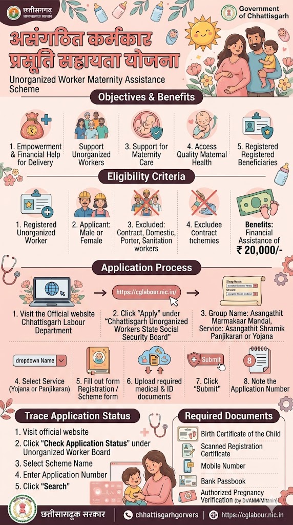 Labor Department of Chhattisgarh State started this scheme “Asangathit Karmakar Prasuti Sahayata Yojana” for unorganized worker on 10 April 2018. The main objective of the scheme to empower unorganized worker by providing financial help for the delivery assistance.