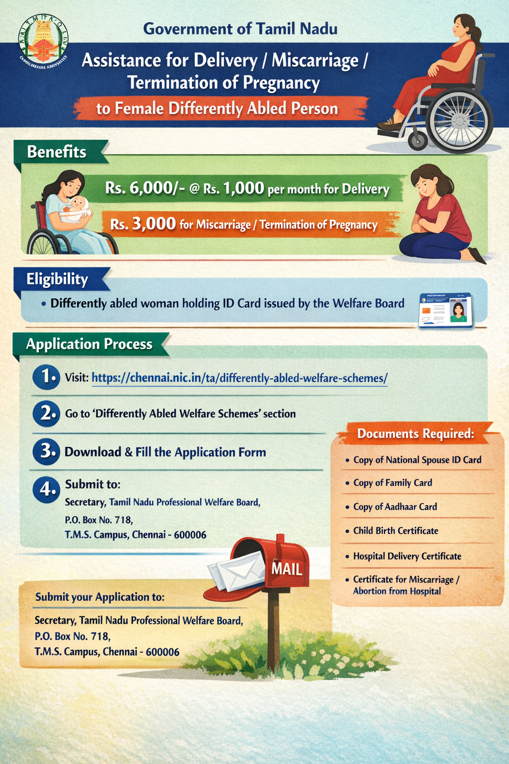 The Government of Tamil Nadu introduced “Assistance for Delivery/ Miscarriage of Pregnancy/ Termination of Pregnancy to Female Differently Abled Person with a sum of ₹6,000/- @ ₹1,000/- per month for delivery and ₹3,000/- for miscarriage/termination of pregnancy is given to female differently abled person.