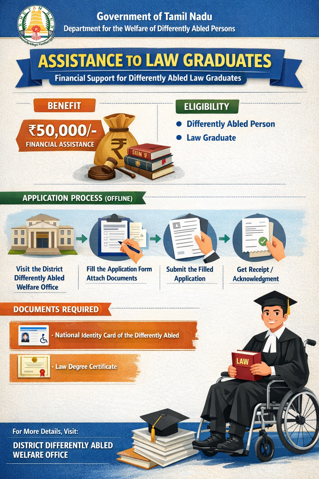The “Assistance to Law Graduates” scheme was launched by the Department for the Welfare of Differently Abled Persons, Government of Tamil Nadu. Under this scheme, financial assistance of ₹50,000/- will be given to the differently abled Law graduates for enrolment in the Bar Council as lawyer and for the purchase of law books.