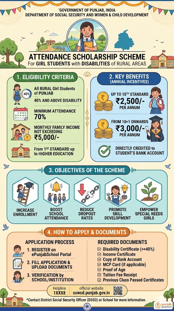 The scheme “Attendance Scholarship Scheme for Girl Students with Disabilities of Rural Areas” was launched by the Department of Social Security and Women & Child Development, Government of Punjab. The objective of this scheme is to uplift the status of the girls with disabilities in rural areas & also to make them reliant by paying incentives in the form of Attendance Scholarship to these girls. The scheme encourages the girl students with disabilities in rural areas to continue their studies and reduce dropouts.