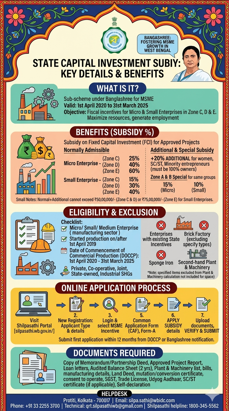 The scheme “State Capital Investment Subsidy” is a sub-scheme under the “Banglashree for Micro, Small and Medium Enterprises” scheme. It was launched on 1st April 2020 by the Department of Micro, Small and Medium Enterprises and Textiles, Government of West Bengal, and shall remain in force till 31st March 2025.