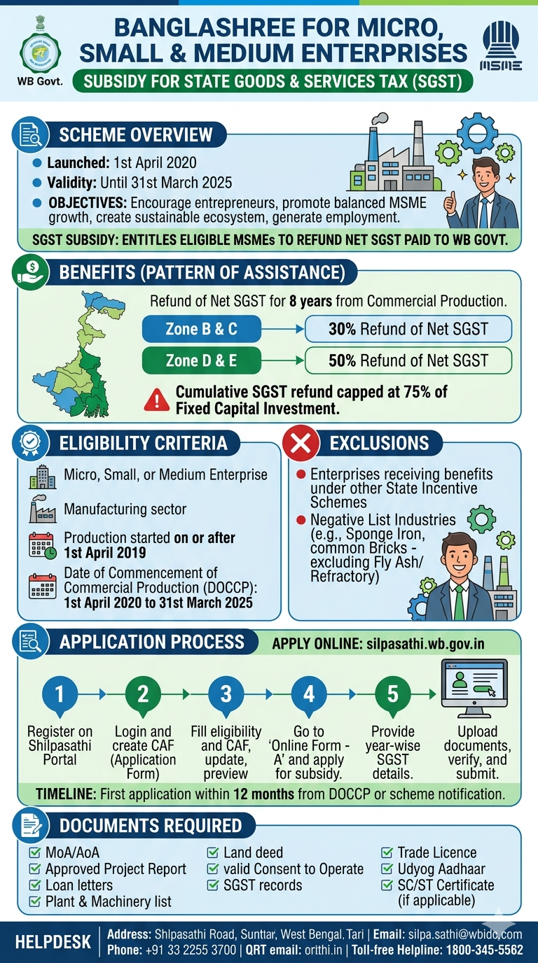 “Subsidy for State Goods and Services Tax (SGST)” is a sub-scheme under the “Banglashree for Micro, Small and Medium Enterprises” scheme. It was launched on 1st April 2020 by the Department of Micro, Small and Medium Enterprises and Textiles, Government of West Bengal, and shall remain in force till 31st March 2025.