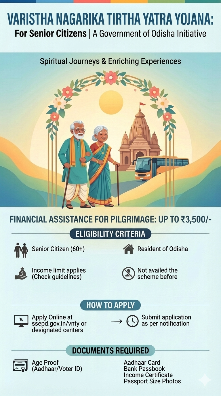 The scheme “Baristha Nagarika Tirtha Yatra Yojana (BNTYY)” was launched by the Department of Tourism, Government of Odisha on 01st February 2016 in collaboration with IRCTC (Indian Railway Catering and Tourism Corporation) wherein the pilgrims will be taken on a visit to different pilgrimage centers in the country from particular boarding points in the state as per the schedule approved for the journeys. The scheme is envisaged to help senior citizens over 60-75 years of age to undertake pilgrimage with Government assistance.
