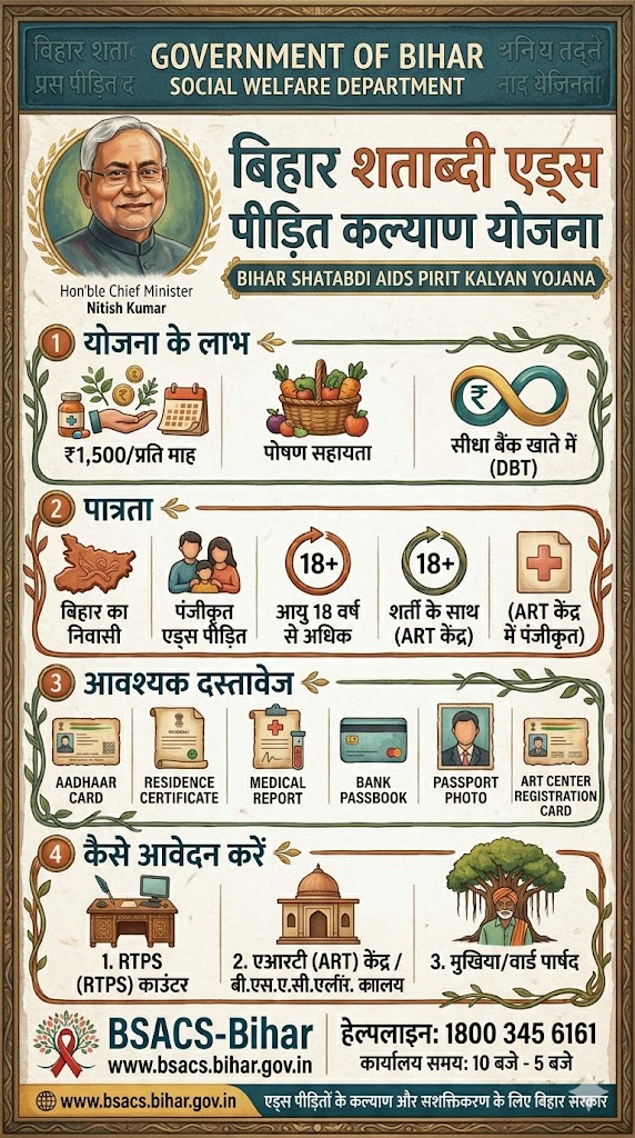The scheme “Bihar Shatabdi AIDS Pirit Kalyan Yojana” was initiated by the Social Welfare Department, Government of Bihar. Under this scheme, financial assistance of ₹1,500/- per month is given to AIDS patients in the state. This scheme is fully funded by the Government of Bihar.