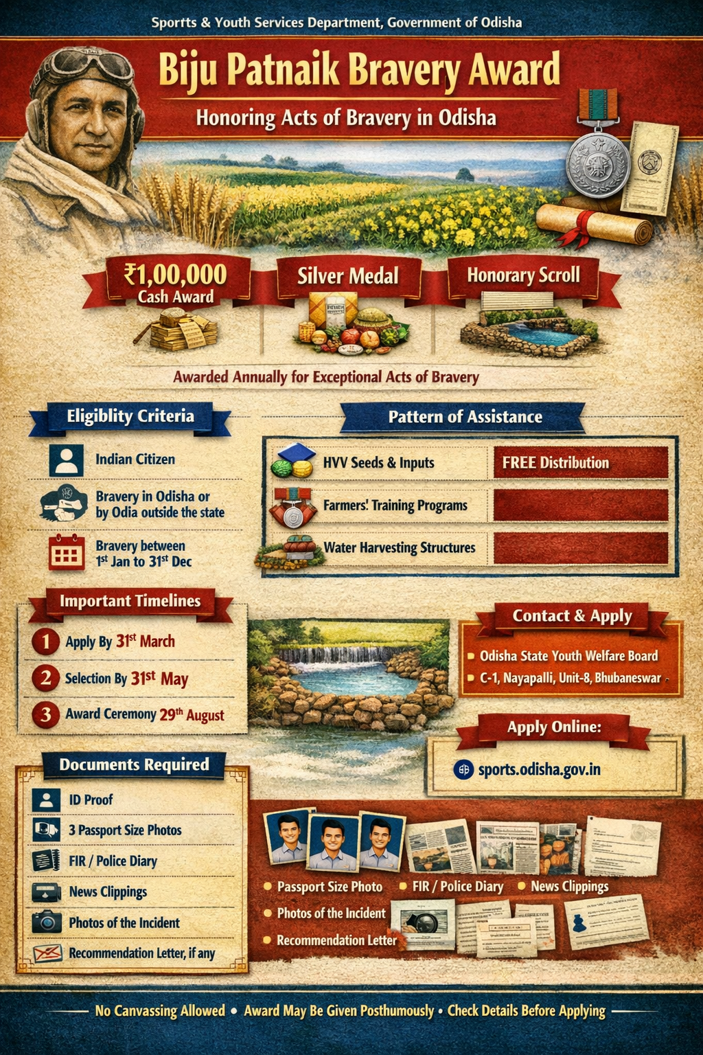 Anybody who performs any spectacular act of bravery inside Odisha will be eligible to be considered for the Award. A resident of Odisha performing the spectacular act of bravery outside will also be eligible for this award.