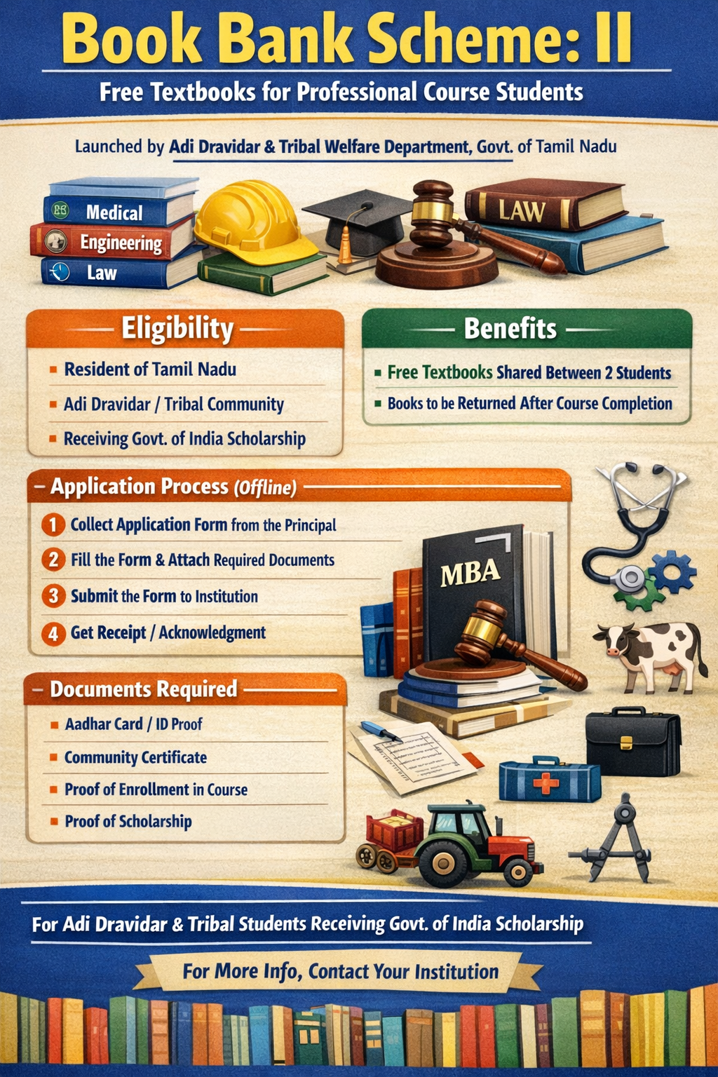 Under the “Book Bank Scheme: II”, launched by the Adi Dravidar and Tribal Welfare Department, Tamil Nadu, textbooks are purchased by the government and provided to libraries in educational institutions for the use of students in professional courses such as Medical, Engineering, Law, MBA, Veterinary, Agriculture, and Polytechnic. Adi Dravidar and Tribal students, who receive the Government of India Scholarship, can access these books during their studies. These books are shared between two (2) students, with the stipulation that they return the books upon course completion to the library.