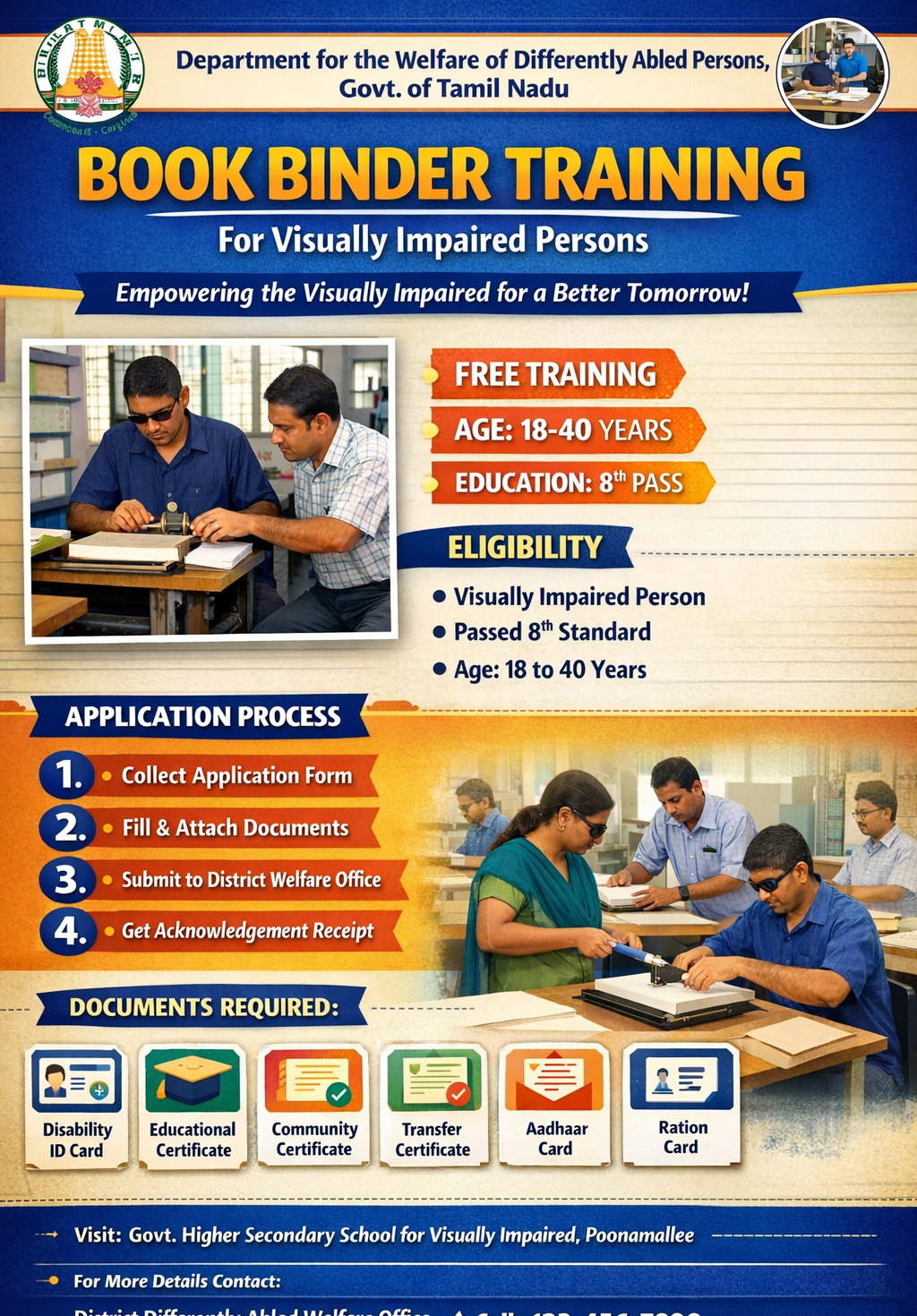 The ‘Book Binder Training by Department for the Welfare of Differently Abled Persons’ was launched by the Department for the Welfare of Differently Abled Persons, Government of Tamil Nadu. The scheme aims to provide imparted book binder training to visually impaired candidates at the government higher secondary school, poonamallee every year.