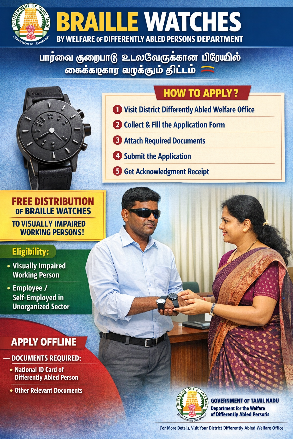 The ‘Braille Watches by Welfare of Differently Abled Persons Department’ scheme was launched by the Department for the Welfare of Differently Abled Persons, Government of Tamil Nadu. Under this scheme, braille watches are distributed to working visually impaired persons to enable them to reach the workplace on time. The applications are accepted offline in the prescribed form available at the District Differently Abled Welfare Office.