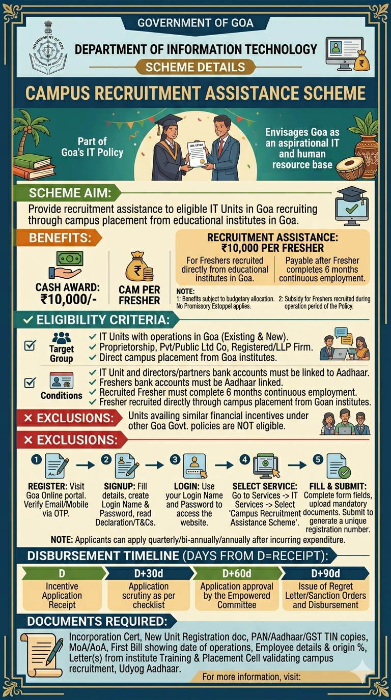 ₹ 10,000 per Fresher will be provided to the units that recruit through Campus recruitment from the educational institutes located in Goa.