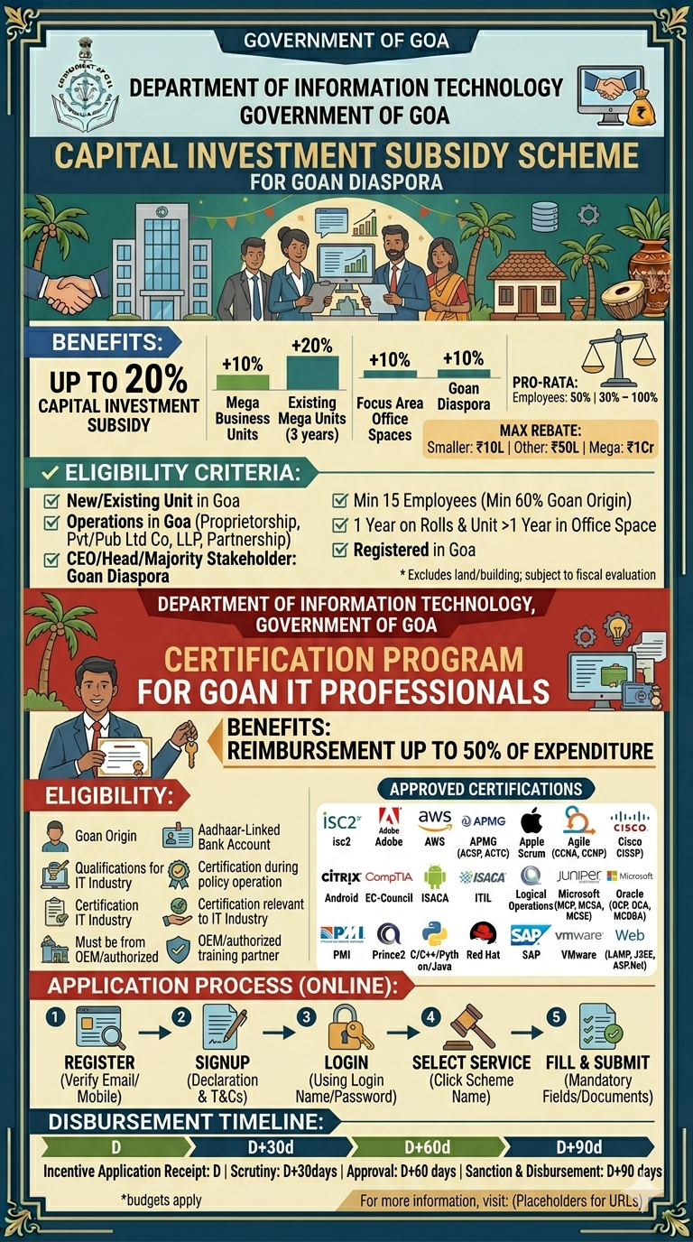 Launched in 2018, the “Capital Investment Subsidy Scheme for Goan Diaspora” is one of the “Information Technology Policy Schemes” by the Department of Information Technology, Government of Goa. All New Units developing office spaces will be eligible for a capital investment subsidy up to 20% on the capital investments made during the tenure of the Scheme. The scheme has been framed as a part of Goa’s IT Policy that envisages Goa as an aspirational geographical and human resource base for IT Units and a preferred destination for their investment and expansion.