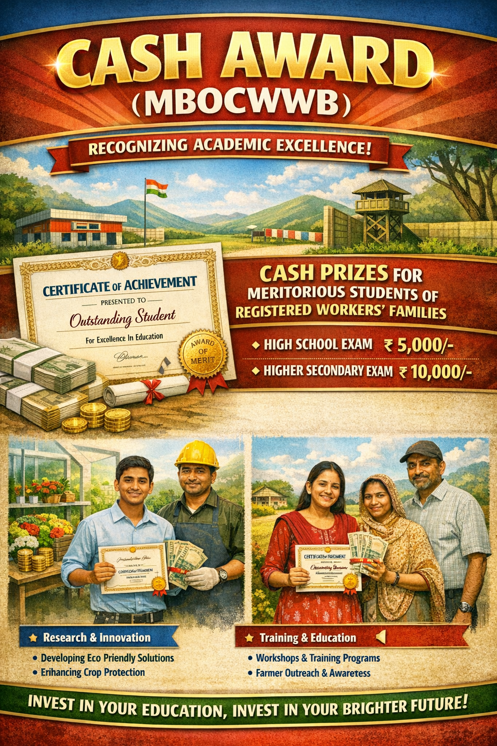The scheme “Cash Award” is a social security scheme, implemented by the Meghalaya Building and Other Construction Workers Welfare Board (MBOCWWB), Labour Department, Government of Meghalaya. Under the scheme, the Board annually awards cash prizes to three male and three female children of registered construction workers in each district who scores the highest marks in the SSLC examination.