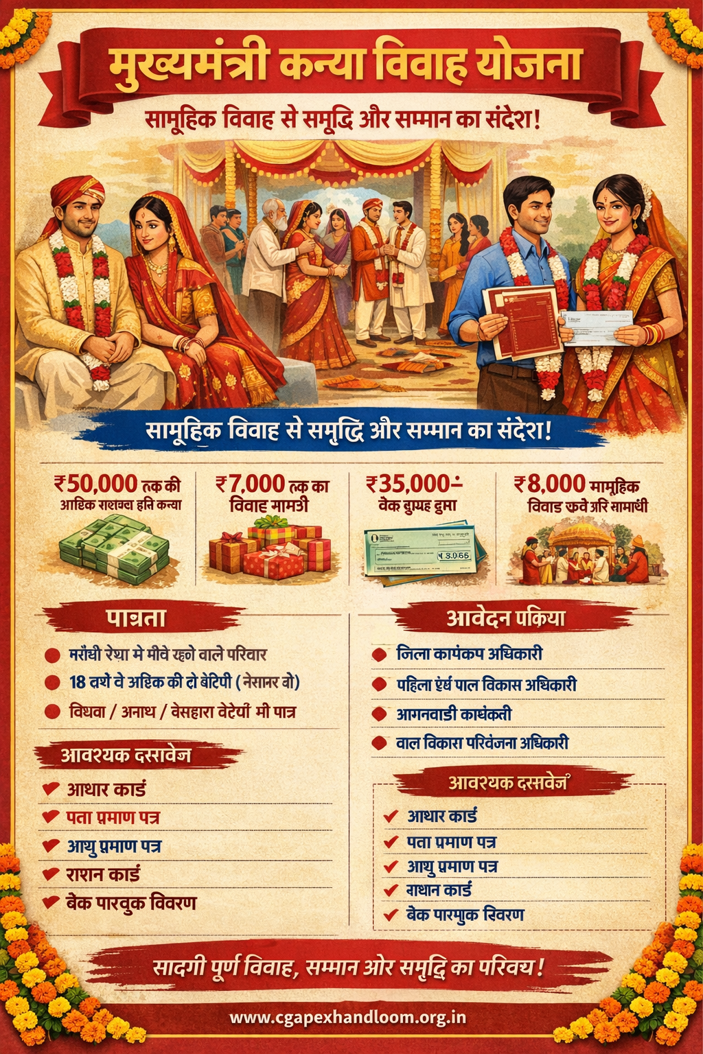 Up to ₹8,000/- can be spent on the mass marriage ceremony per beneficiary.