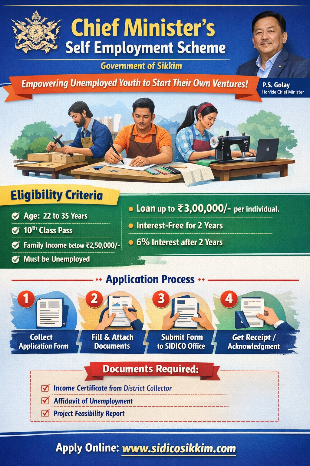 The “Chief Minister’s Self Employment Scheme” was launched by the Department of Personnel, and Reforms, Training, Public Grievances, Government of Sikkim. The scheme aims to provide loan to unemployed youth who belong below the poverty line. The Chief Minister’s Self Employment Scheme shall be a link program for all those unemployed youth who are trained in the Constituency wise Livelihood schools across the State, irrespective of their educational qualification and age to start up self-employment ventures in business, service and industrial activities.
