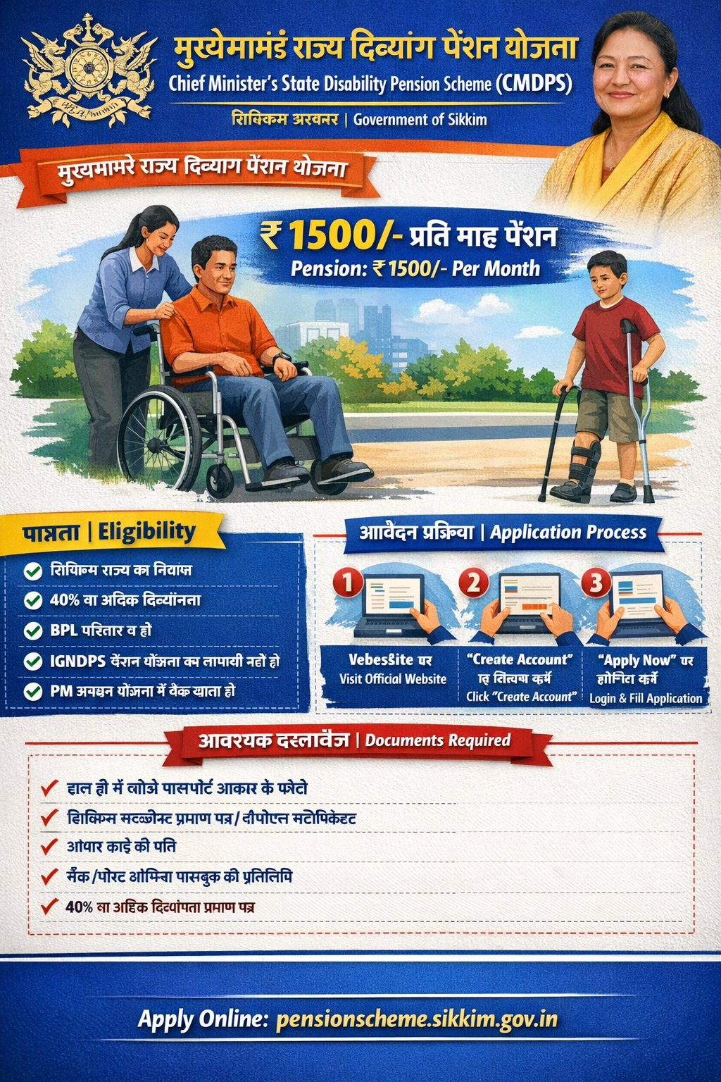 The scheme “Chief Minister’s State Disability Pension Scheme (CMDPS)” was started by the Women & Child Welfare Department, Govt. of Sikkim to provide financial assistance to the differently abled person who has a disability of 40% and above. This scheme is 100% State Innovative Scheme and the beneficiary will receive a monthly pension of ₹ 1500/-.