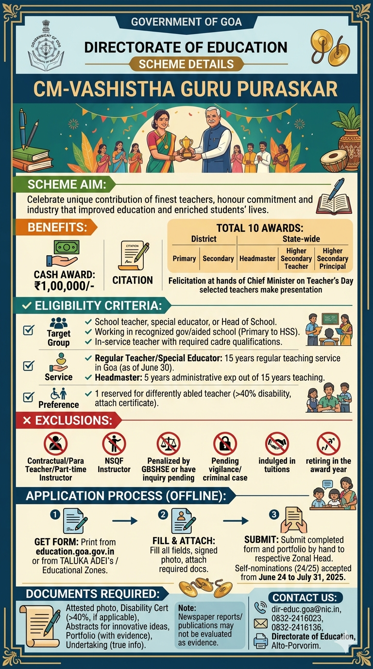 The scheme “CM-Vashistha Guru Puraskar” was launched by the Directorate of Education, Government of Goa. The scheme aims to celebrate the unique contribution of some of the finest teachers in the state and to honour those teachers who through their commitment and industry have not only improved the quality of school education but also enriched the lives of their students. The scheme provides State Awards to Teachers, with each award consisting of a cash amount of ₹1,00,000/- (Rupees One Lakh) and a citation.