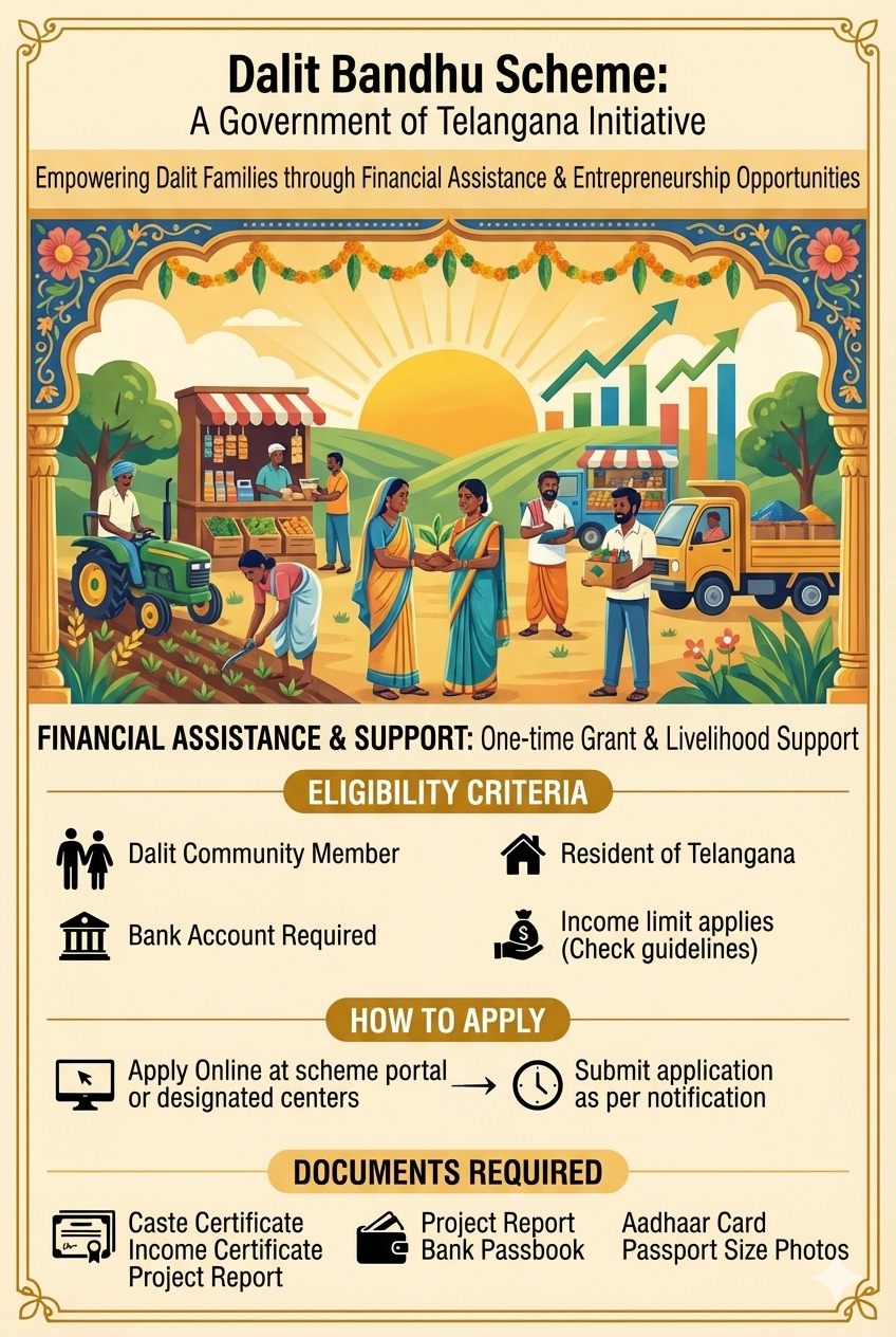The Dalit Bandhu Scheme is a unique initiative launched by the government of Telangana to promote the economic development of families belonging to the Scheduled Caste (SC) community. The scheme provides financial assistance of Rs. 10 lakhs to eligible SC families to start their own businesses or entrepreneurial ventures, thereby creating opportunities for them to become self-reliant and improve their standard of living.