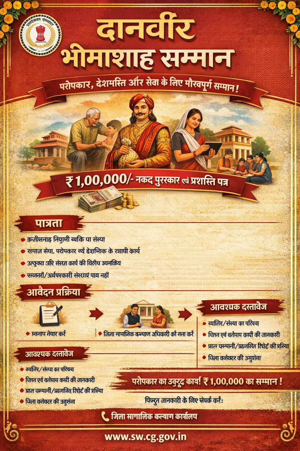 The scheme “Danveer Bhamashah Honors” is implemented by the Social Welfare Department, Government of Chhattisgarh, aims to encourage the spirit of charity, harmony, patriotism, sacrifice, and cultural devotion among all sections of the society in the state. The state government has decided to give it to encourage the contributions of outstanding individuals/organizations that provide charity, hospitality, and exemplary assistance in the state of Chhattisgarh.