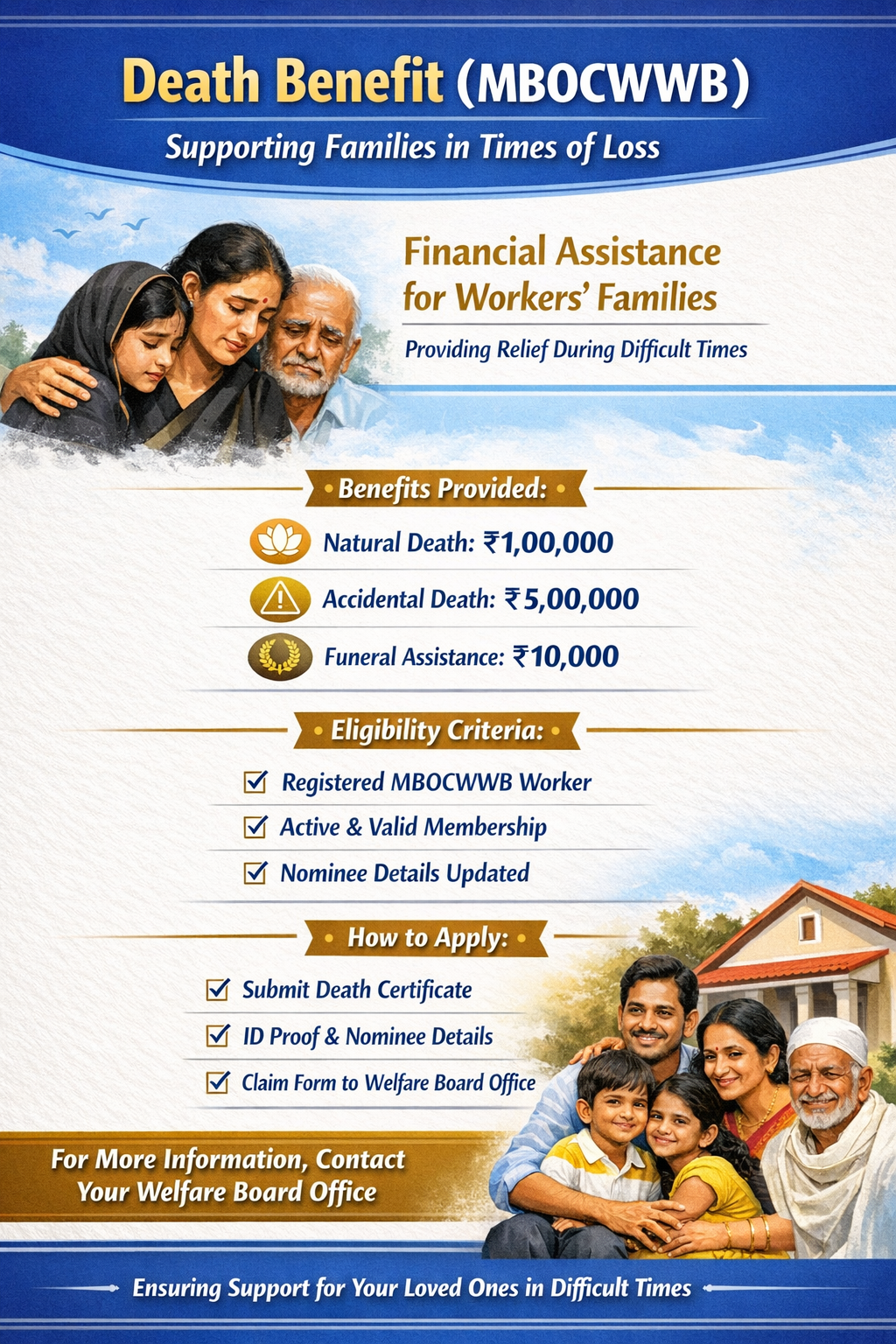 The scheme “Death Benefit” is a social security scheme, implemented by the Meghalaya Building and Other Construction Workers Welfare Board (MBOCWWB), Labour Department, Government of Meghalaya. Under the scheme, financial assistance shall be provided to the nominees or dependents of registered construction workers in the event of their natural or accidental death during the course of employment.