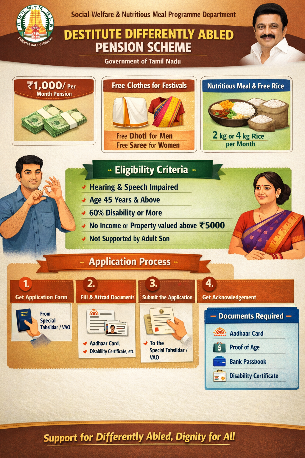 The “Destitute Differently Abled Pension Scheme” was launched by the Social Welfare and Nutritious Meal Programme Department, Government of Tamil Nadu. The scheme aims to provide a pension of ₹1,000/- to differently-abled persons with disability 60% and above. One free saree to females and one free dhoti to males is given on Pongal and Diwali. A nutritious meal is provided to the beneficiaries.