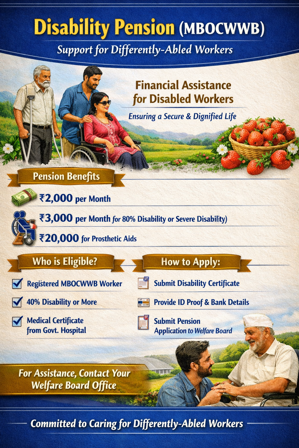 The scheme “Disability Pension” is a social security scheme, implemented by the Meghalaya Building and Other Construction Workers Welfare Board (MBOCWWB), Labour Department, Government of Meghalaya. Under the scheme, the Board shall provide financial assistance in the form of a disability pension to a beneficiary who is permanently disabled due to paralysis, leprosy, tuberculosis (T.B.), accidents, etc. Additionally, the worker will be eligible for an ex-gratia payment based on the percentage of disability and subject to conditions as may fixed by the Board.