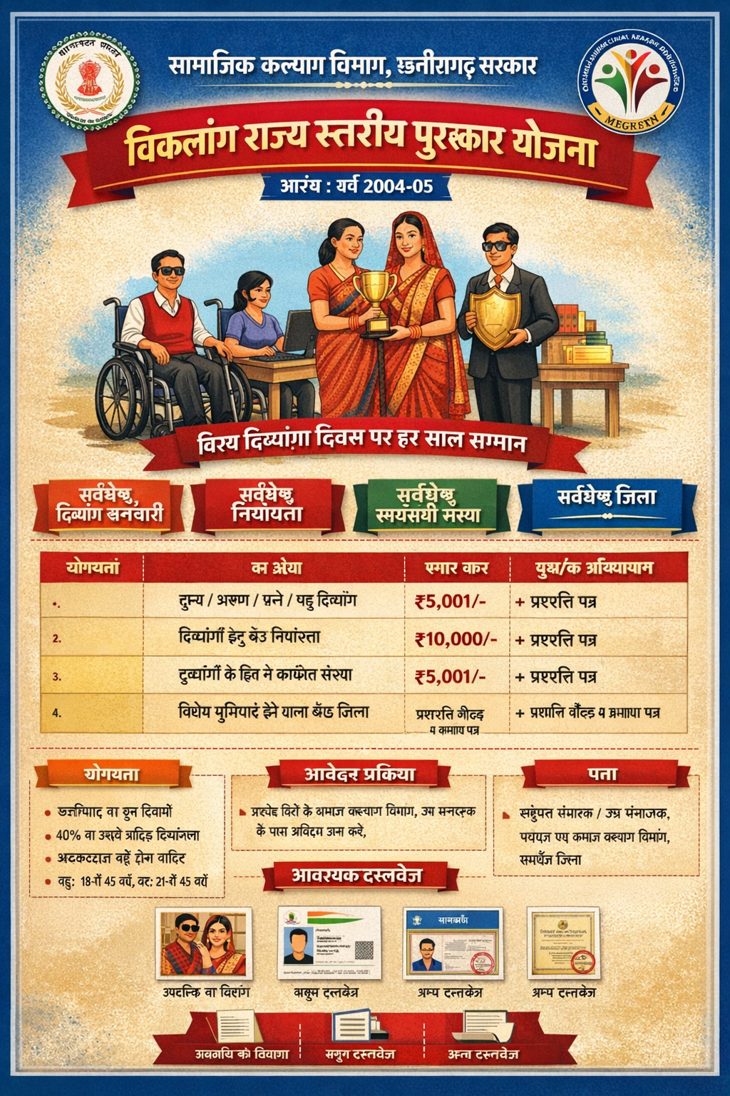 The scheme “Disabled State Level Award Scheme” is implemented by the Social Welfare Department, Government of Chhattisgarh. The objective of the scheme is to encourage persons with disabilities and organizations working for the interests of persons with disabilities and to motivate the community for the overall rehabilitation of persons with disabilities.