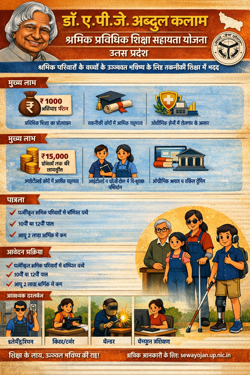 The Dr. APJ Abdul Kalam Shramik Pravidhik Shiksha Sahayata Yojana (DAKSPSSY) is a scheme launched by the Government of Uttar Pradesh to provide financial assistance to the children of registered workers for pursuing technical education. The scheme aims to promote technical education among the children of workers and help them build a better future.