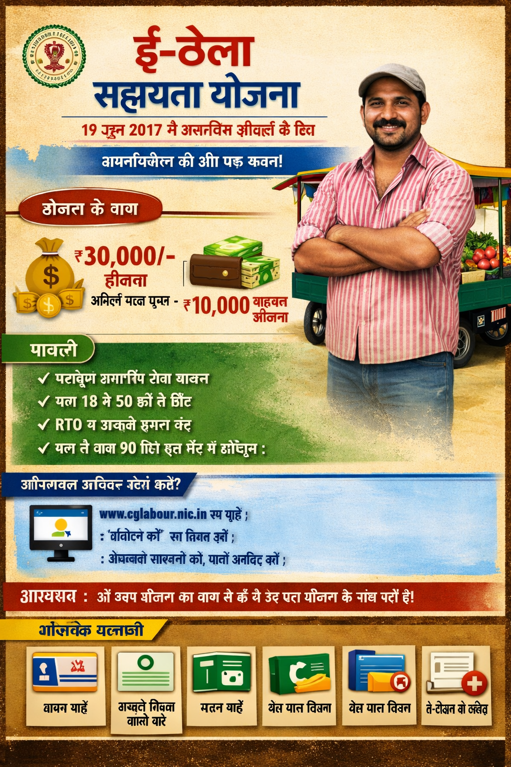 Labor Department of Chhattisgarh State started this scheme “E-Thela Sahaayata Yojana” for unorganized worker on 19 June 2017. The main objective of the scheme to empower unorganized worker by providing financial assistance for e-thela.