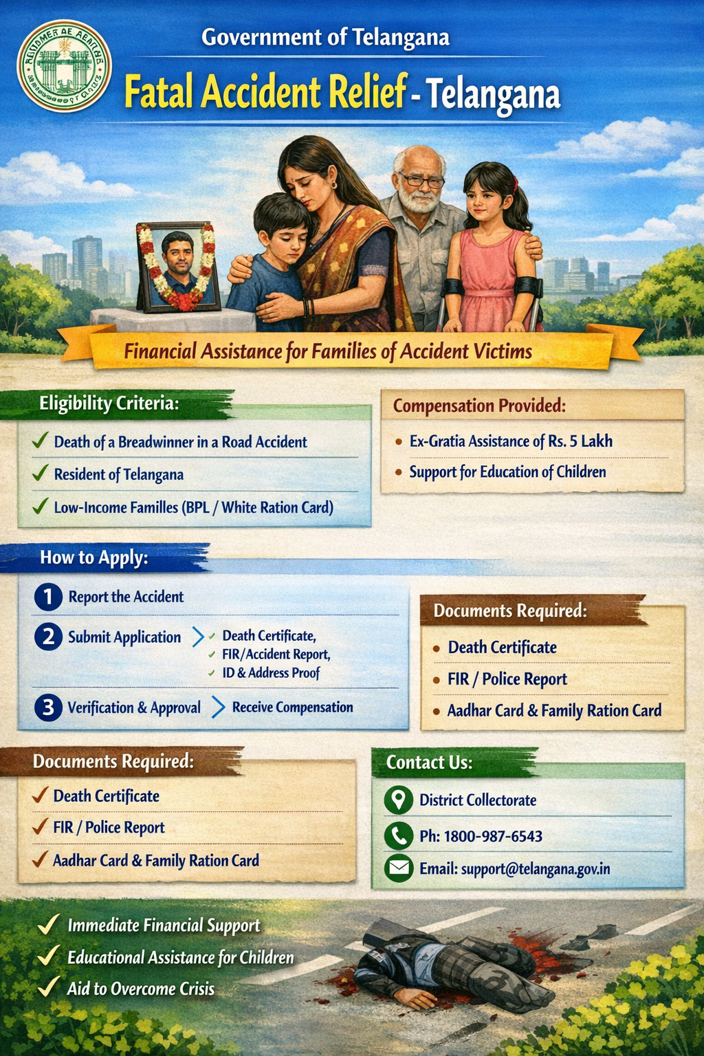 The “Fatal Accident Relief” scheme was launched by the Telangana Building and Other Construction Workers Welfare Board (TB&OCWWB), LET&F (Labour) Department, Telangana. The scheme aims to provide financial support to the nominee, dependents, or legal heirs of registered building and other construction workers in the unfortunate event of their accidental death. The scheme offers a substantial relief amount to help the families cope with the sudden loss of their breadwinner.