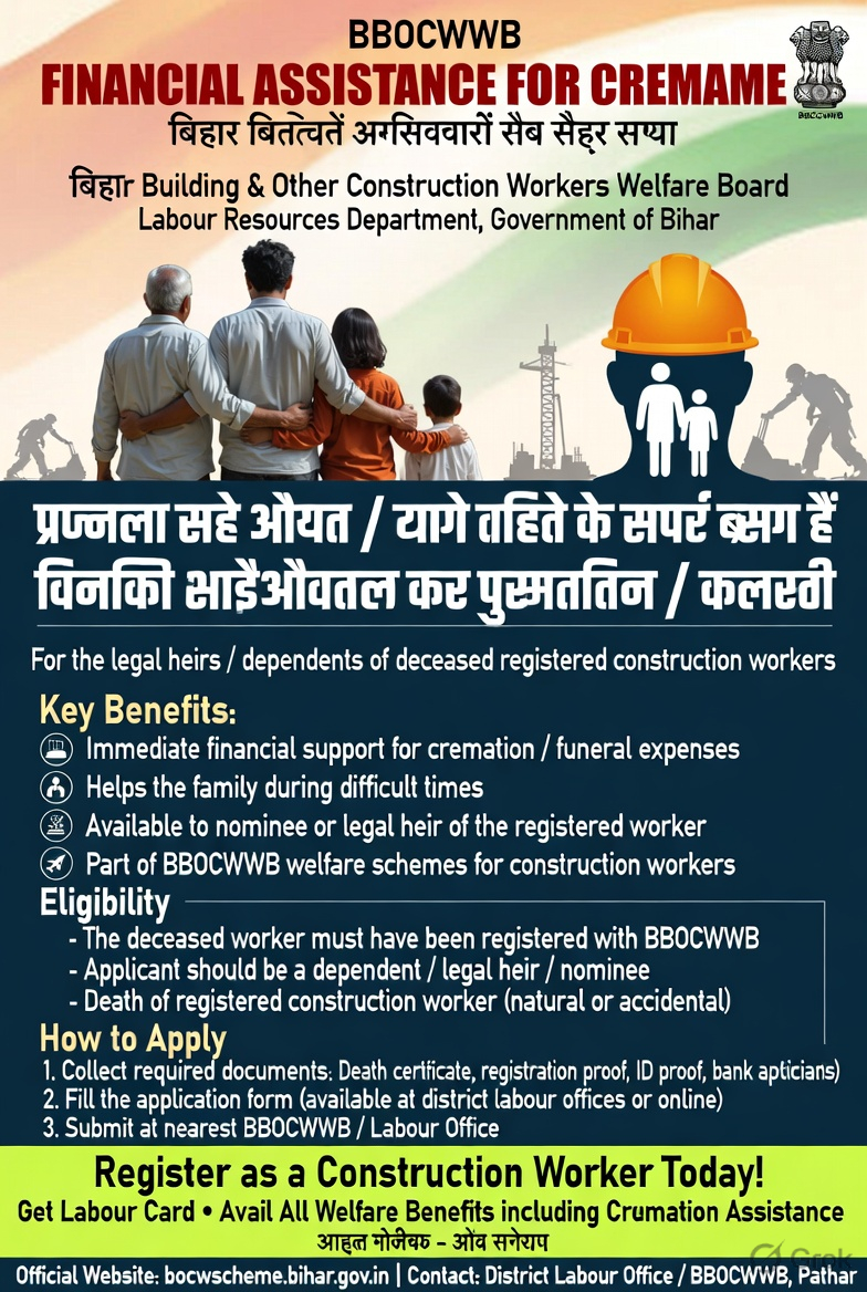 The scheme “Financial Assistance for Cremation” by the Bihar Building & Other Construction Workers Welfare Board, Labour Resources Department, Government of Bihar, provides financial assistance of ₹5,000/-to the dependents of the deceased worker for performing cremation.