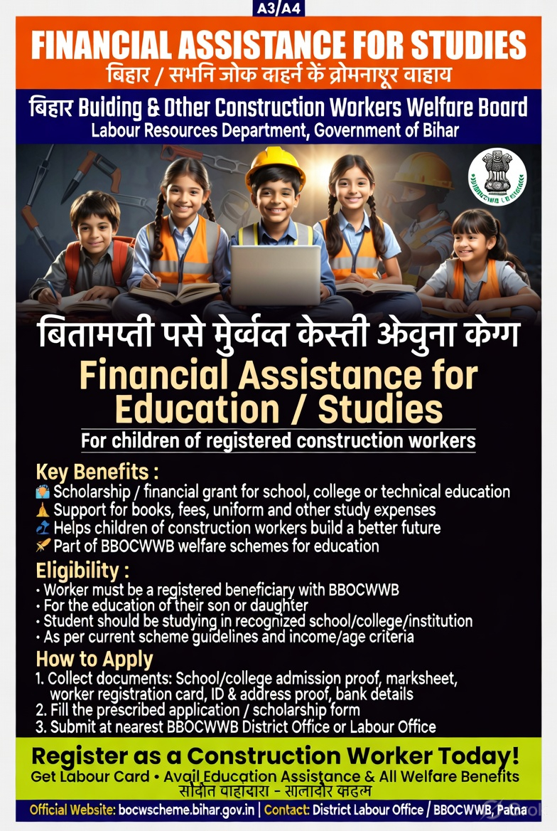 The “Financial Assistance for Studies” scheme is implemented by the Bihar Building & Other Construction Workers Welfare Board (BBOCWWB), under the Labour Resources Department, Government of Bihar. Under this scheme, educational financial support is provided to the children of registered workers who have been members of the Board for at least one year. It covers full tuition fees for students admitted to prestigious government institutes like IIT, IIM, and AIIMS. Additionally, the scheme offers one-time financial assistance for pursuing B.Tech or equivalent courses, Polytechnic/Nursing diplomas, or ITI courses in government institutions.