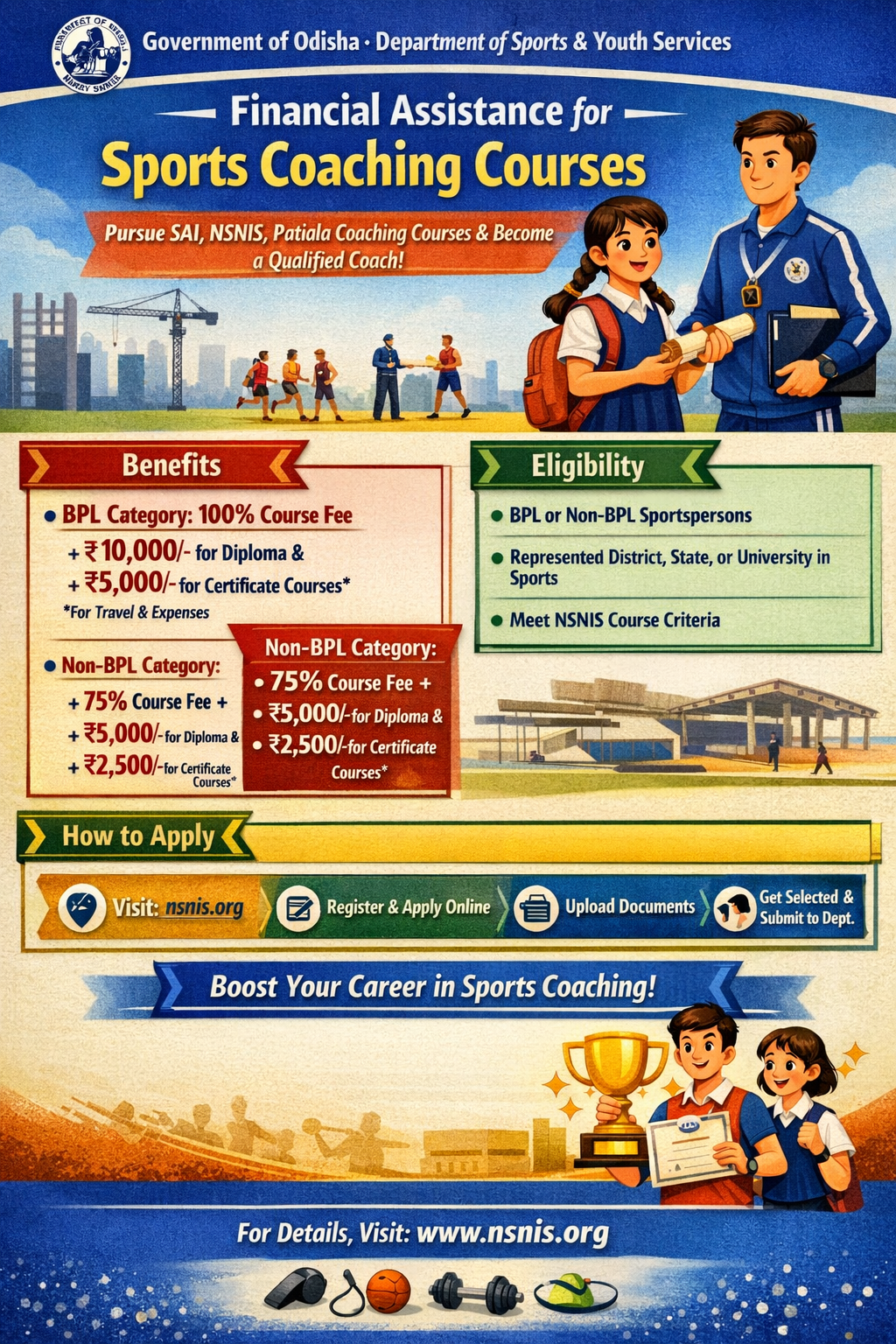 The Scheme “Financial Assistance to Sportspersons to Pursue Sports Coaching Courses Conducted by SAI, NSNIS, Patiala as a Part of Skill Development Programme to Improve their Employability” was launched by the Department of Sports & Youth Services Department, Government of Odisha to provide financial assistance to sportspersons of Odisha to help them become qualified coaches, by undertaking SAI, NSNIS coaching courses, so as to improve their employability.
