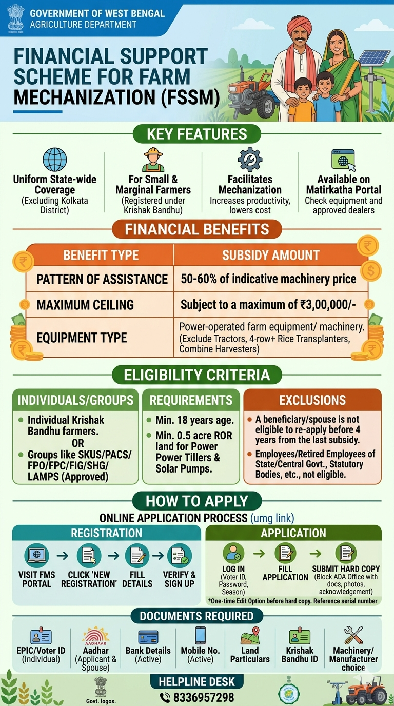 “Financial Support Scheme for Farm Mechanization (FSSM)” under the Farm Mechanization Umbrella Scheme, was launched on 5″ December 2012 by the Agriculture Department, Government of West Bengal for extending financial support as subsidy to the small and marginal farmers of the State for purchase of power operated farm equipment/ machinery with the aim to facilitate mechanization in agriculture so as to ensure better productivity and minimization of cost of cultivation.