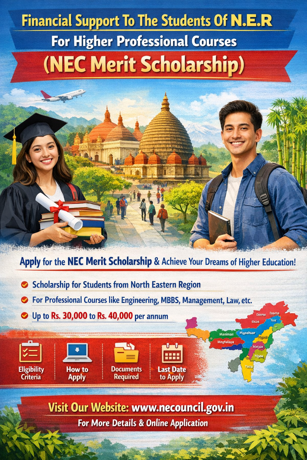A scholarship scheme by the North Eastern Council (NEC), Ministry of Development of North Eastern Region for the students of the North Eastern States undergoing studies in different disciplines at different levels in Institutions inside as well as outside the North-East but within the country as specified hereinafter. The scholarship under this scheme shall be disbursed only through National Scholarship Portal (NSP). The scholarship shall be admissible to students who get admission in Diploma, Degree, Post-graduate or registration in M.Phil. / Ph.D. courses of any institute recognized by the Government. The grant of scholarship for M.Phil and Ph.D. would be after the registration of the students with the University. The scholarship shall be admissible to the students whose parent/guardian’s annual income from all sources shall not exceed ₹8,00,000.