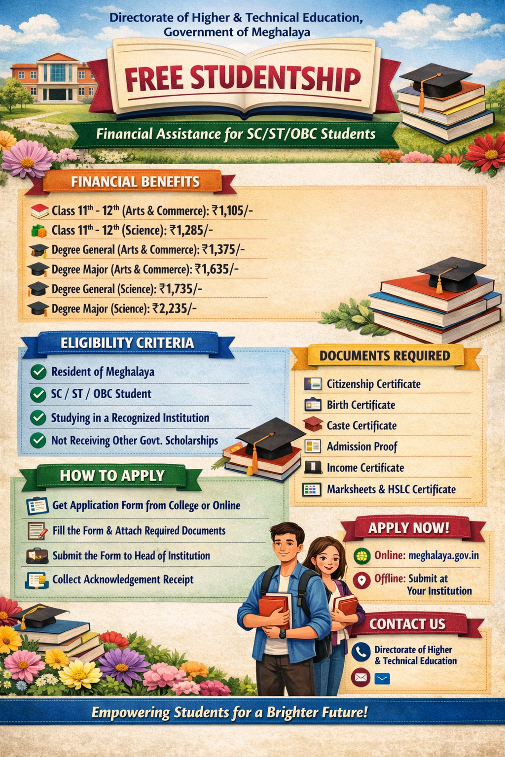 The scheme “Free Studentship” by the Directorate of Higher & Technical Education, Meghalaya, is a state-sponsored program aimed at providing financial assistance to students belonging to the SC/ST/OBC categories for their tuition fees and other fee according to prescribed rates.