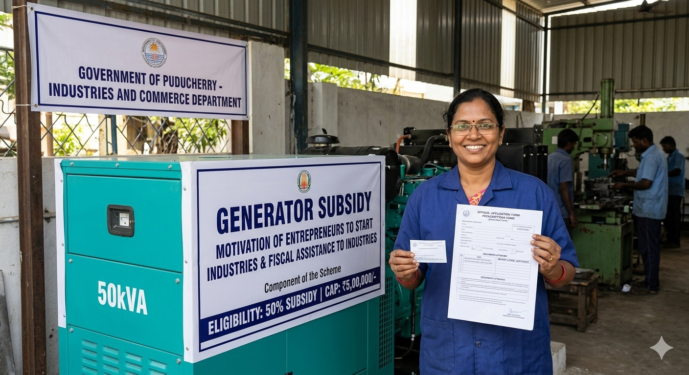 The “Generator Subsidy” is a Component of the “Motivation of Entrepreneurs to Start Industries and Fiscal Assistance to Industries” Scheme by the Industries and Commerce Department, Union Territory of Puducherry. Through this scheme, the micro, small and medium industrial units (manufacturing and service sector) shall be eligible for the grant of 50% subsidy with a cap of ₹5,00,000/- per industrial unit on the investment made on or after 5-3-2009 on generator sets. The applications are accepted offline in the prescribed form available on the Official Website of the Department.