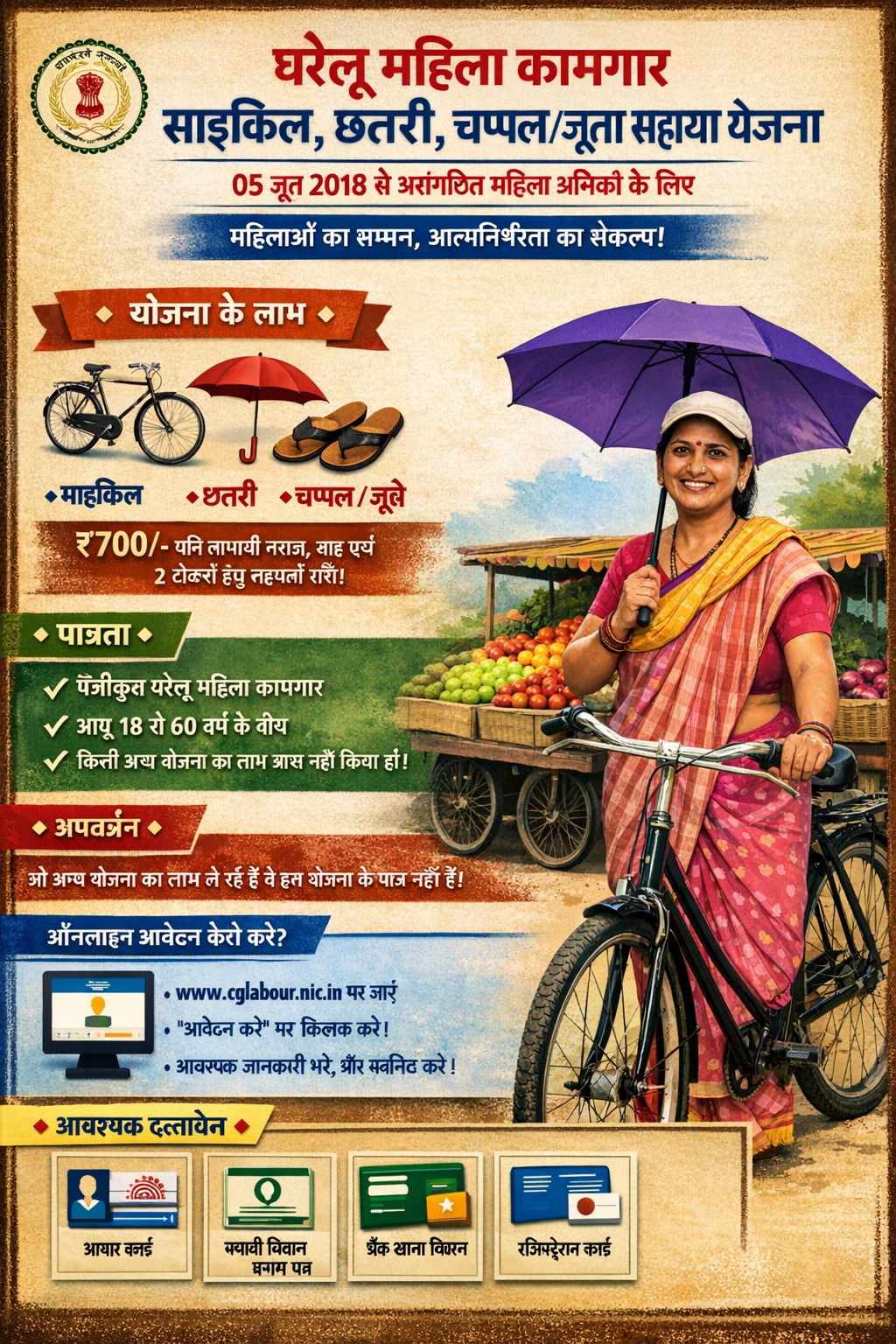 Labor Department of Chhattisgarh State started this scheme “Gharelu Mahila Kamgar Cycle, Chhatari, Chappal/Joota Sahayta Yojana” for unorganized worker on 05 June 2018. The main objective of the scheme to empower unorganized worker by providing required equipment/items.
