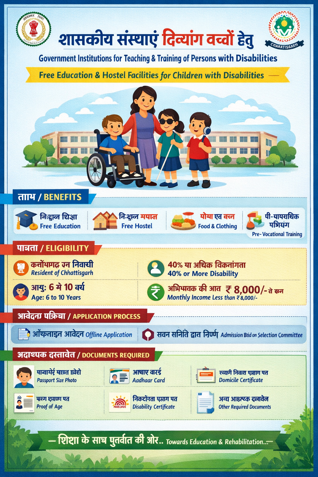The scheme “Government Institutions for Teaching and Training of Persons with Disabilities” was implemented by the Social Welfare Department, Government of Chhattisgarh. The objective of the scheme is to arrange for the education and rehabilitation of children with disabilities by providing them free hostel, education-training, food, clothing, and residential facilities.
