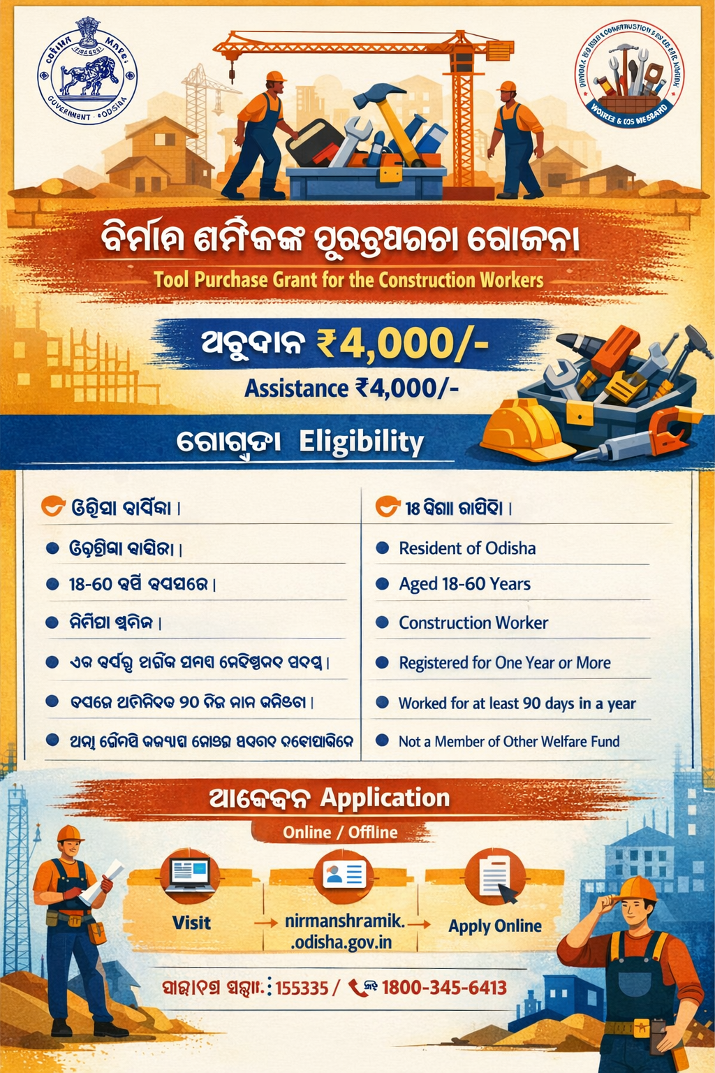 The “Tool Purchase Grant for the Construction Workers” scheme by the Building and Other Construction Workers Welfare Board, Labour Department, Odisha, is a welfare scheme for the registered workers of the board. Under this scheme, the Board shall make one time reimbursement to each beneficiary who is registered with the Board for purchasing tools on production of original bill/ voucher.