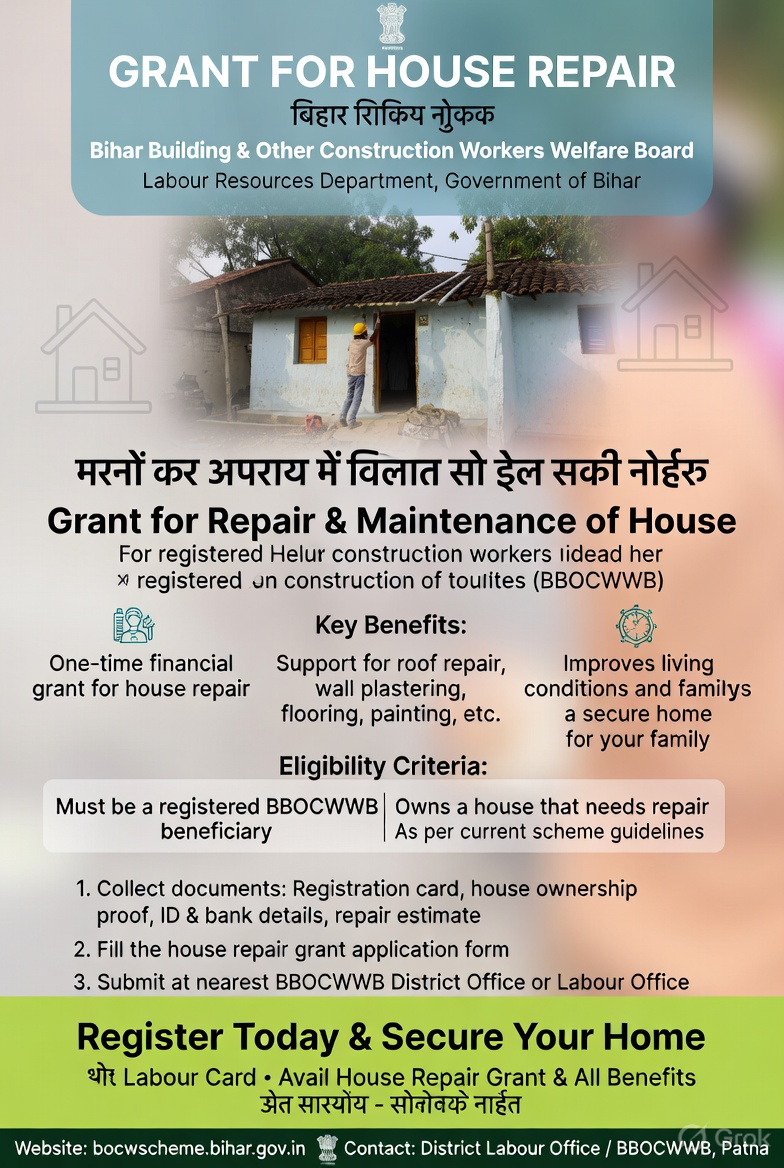 The “Grant for the Repair of House” scheme is implemented by the Bihar Building & Other Construction Workers Welfare Board (BBOCWWB), Labour Resources Department, Government of Bihar. Under this scheme, financial assistance of ₹20,000/- is provided to registered construction workers who have been members of the Board for at least three years for the repair of their house. However, workers who have already received financial assistance for house construction, bicycles, or tools are not eligible for this benefit. The assistance is provided only once to each eligible worker.