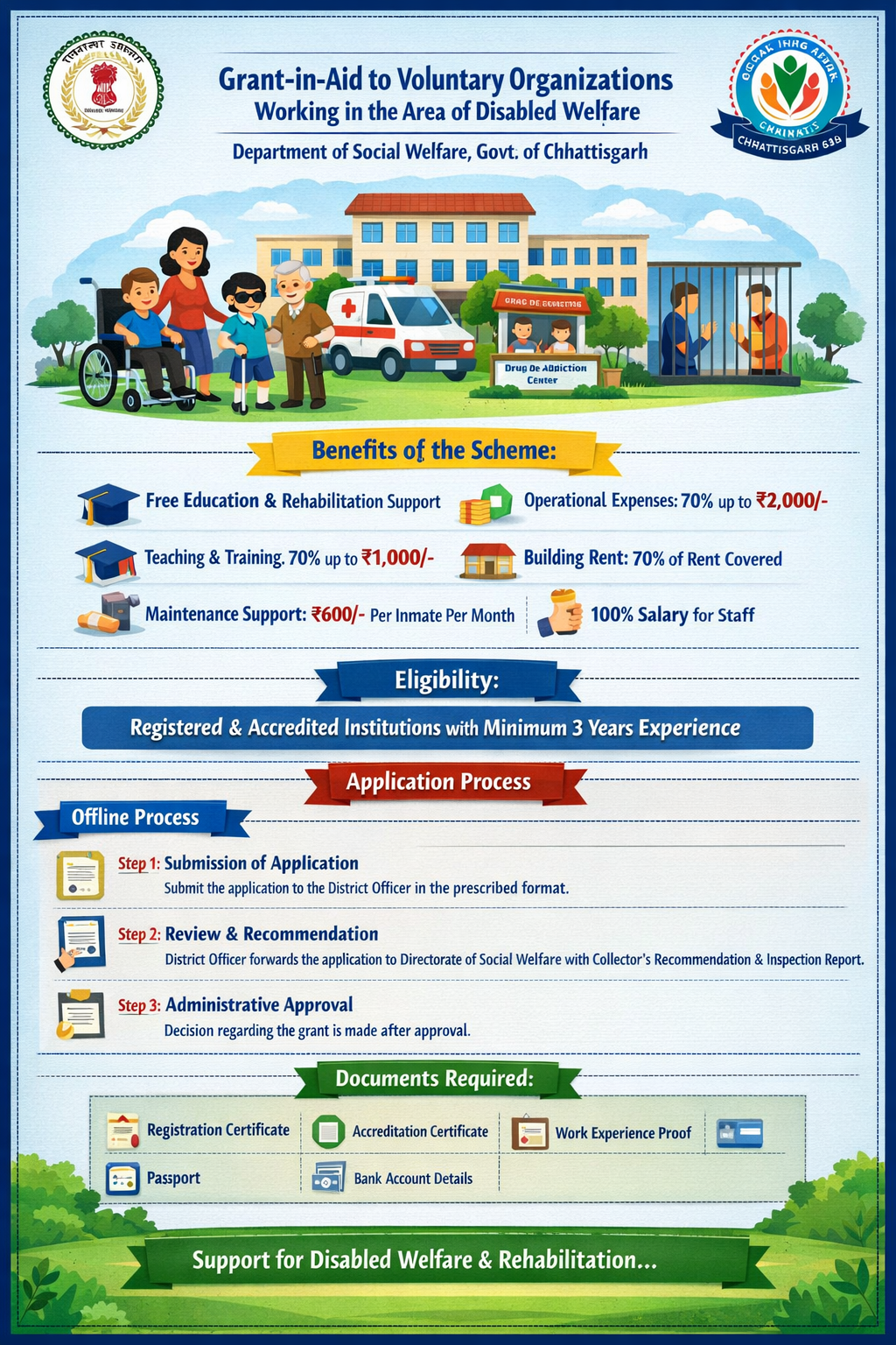 Launched in 2018, the scheme “Grant-in-aid to Voluntary Organizations Working in the Area of Disabled Welfare” by the Department of Social Welfare, Government of Chhattisgarh, aims to support institutions working for the welfare of disabled individuals. Through this scheme, grants for free education, training, residential arrangements, and rehabilitation are provided to disabled immigrants. The scheme is implemented by the Directorate of Social Welfare. Additionally, grants cover salaries, ambulance services, building rent, and office expenses. The scheme also promotes activities such as drug de-addiction and managing institutions under the Juvenile Act and Old Age Homes.