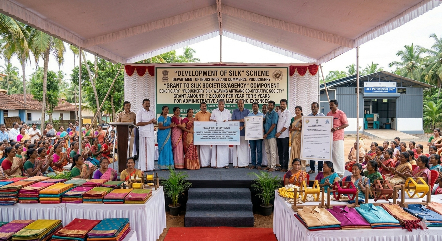 The “Grant to Silk Societies/Agency” Component of the “Development of Silk” Scheme by the Department of Industries and Commerce, Union Territory of Puducherry, aims to encourage the silk weaving artisans to form registered societies/agencies to develop a cluster approach among the artisans which is effective and advisable at present for the successful development of their business.