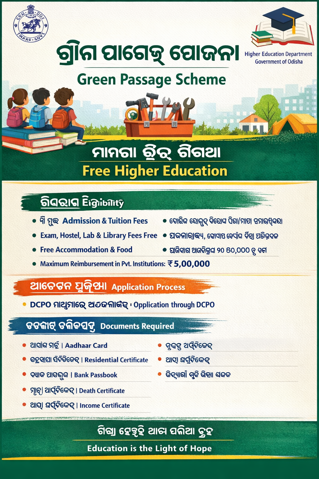 Launched in 2016-17, the “Green Passage Scheme” Scheme by the Higher Education Dept., Govt. of Odisha provides free higher education to children without biological or adoptive parents. After the outbreak of the COVID-19 pandemic, the scheme was revised to as well cover children who lost their both parents or single parent during the COVID-19 pandemic. Under this scheme, the fees like application fees, admission/readmission fees, tuition fees, examination fees, hostel admission fees, laboratory fees, library fees, college development fees, etc. will be exempted for eligible students. The institutions will also provide free accommodation and food to such students.