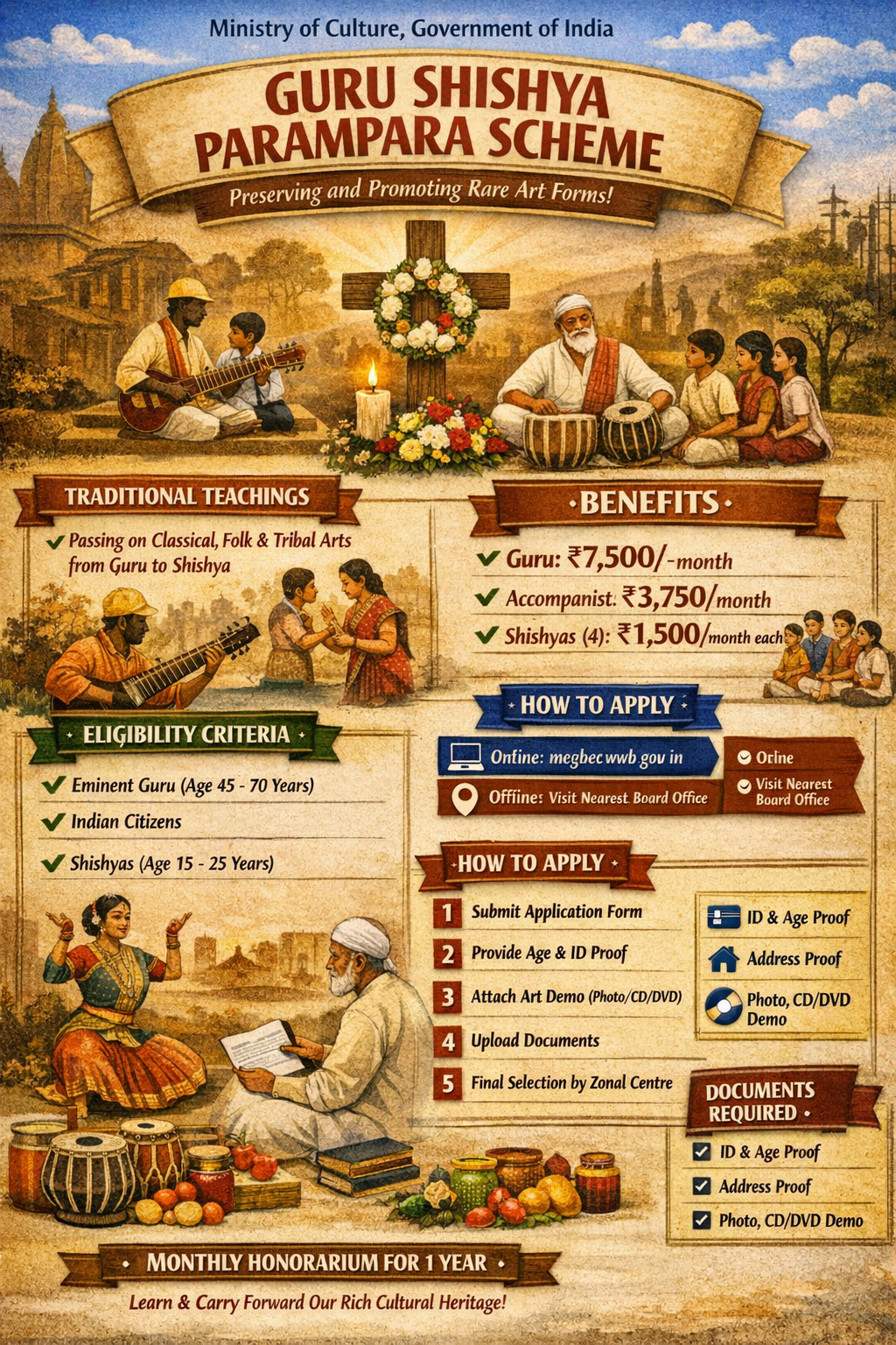 The government of India, Ministry of Culture runs a scheme called “Guru Shishya Parampara Scheme” through Zonal Cultural Centres to preserve and promote rare and vanishing art forms on Classical or Folk/Tribal so that the young talents be nurtured to acquire skills in their chosen field of art under the able guidance of Gurus.